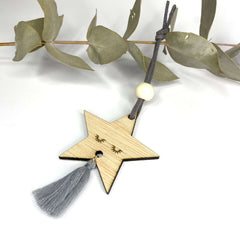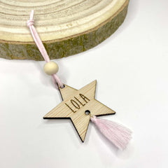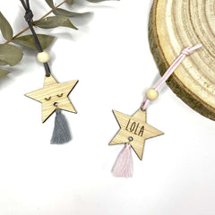 Colgador infantil artesanal en forma de estrella, realizado con corte y grabado láser y que cuenta con una borla de color a juego. Este detalle es perfecto para bautizos y comuniones ya que combina personalización única con un diseño tierno y festivo.