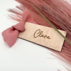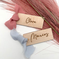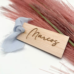 Agrega un toque personal a tus eventos con nuestros marcasitios de madera rectangular, personalizados con el nombre de cada invitado.