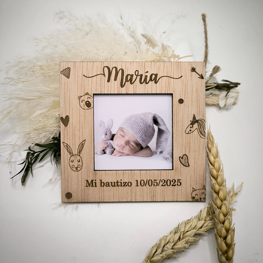 Captura los recuerdos más especiales del bautizo de tu bebé con este hermoso marco de fotos personalizado. Fabricado en madera de alta calidad, este diseño único incluye grabados láser con el nombre del bebé, la fecha del evento, y adorables ilustraciones infantiles como ositos, conejos y corazones que aportan un toque encantador.