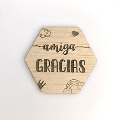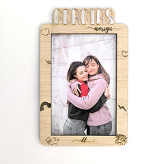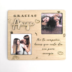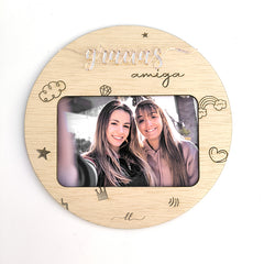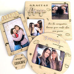 Este pack está compuesto por un cuadro para una foto, un cuadro para dos fotos pequeñas, un cuadro en forma circular y un imán, todo de madera combinado con detalles en metacrilato.