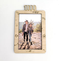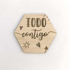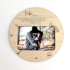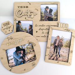 Este pack está compuesto por un cuadro para una foto, un cuadro para dos fotos pequeñas, un cuadro en forma circular y un imán, todo de madera combinado con detalles en metacrilato.