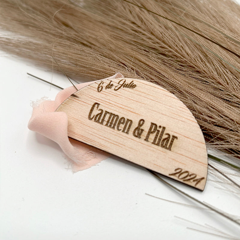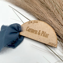 Personalizable con el grabado que prefieras y el color del lazo que más se adapta a tus necesidades, es ideal para bodas, comuniones y más.