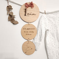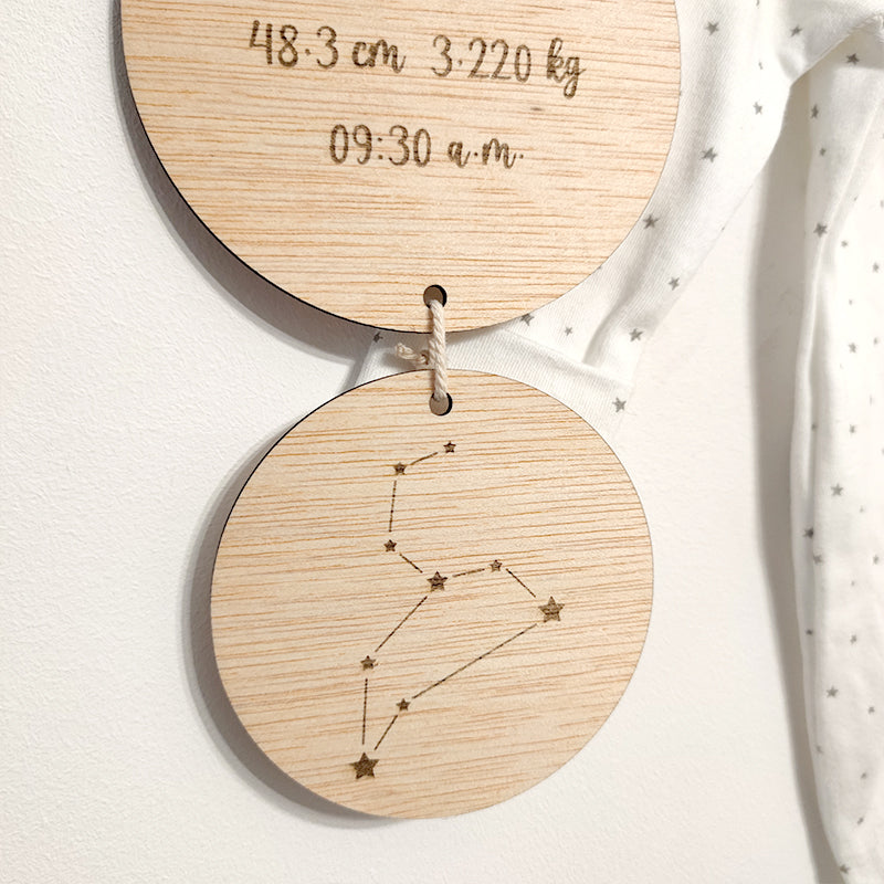 Tres círculos únicos: nombre, datos de nacimiento y constelación. Un regalo significativo y personal. Hecho con detalle y calidad, captura la esencia de ese momento especial.