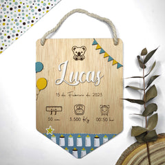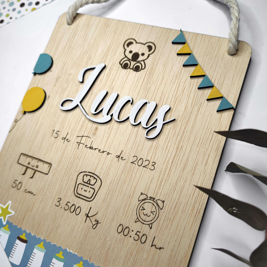 Celebra el nacimiento de tu pequeño tesoro con nuestro natalicio infantil personalizado en madera. Grabado con láser, incluye el nombre, fecha, peso, talla y hora de nacimiento. Añade papel decorado totalmente personalizable.